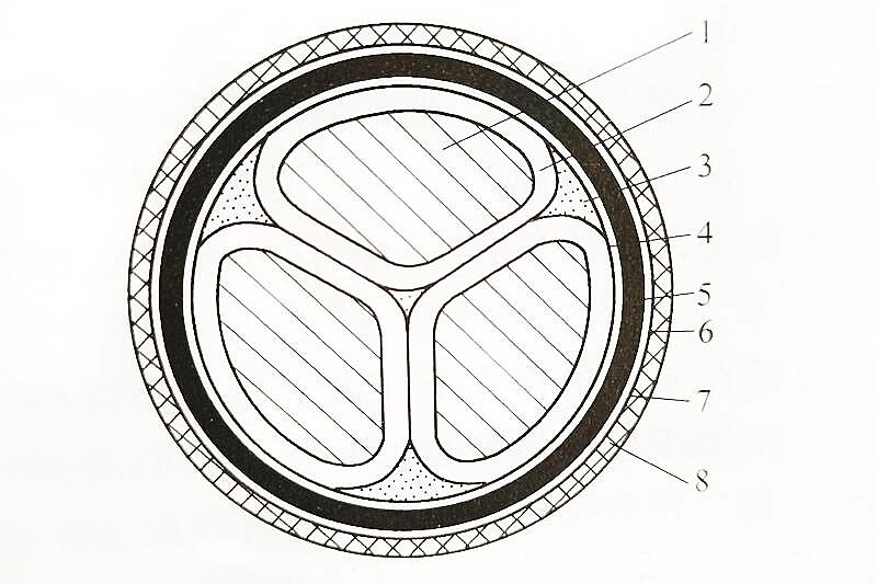 油浸紙絕緣電纜:包括鉛包、鋁包、鎧裝和無鎧裝等。常見的三芯油浸紙絕緣電纜結構圖如圖所示。