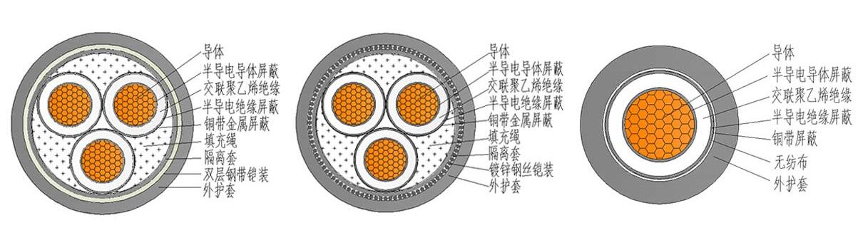 其結構由內至外分別為:1、導體;2、導體屏蔽;3、絕緣層;4、絕緣屏蔽;5、銅帶屏蔽;6、填充物;7、包帶;8、內護套層;9、鎧裝層;10、外護套。
